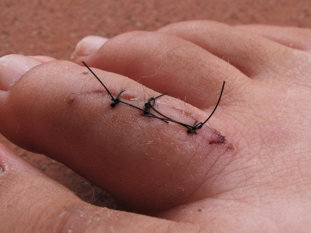 The same toe, eight days later, just before I had the pleasure of removing the stitches (video to be uploaded to the videos page soon!)